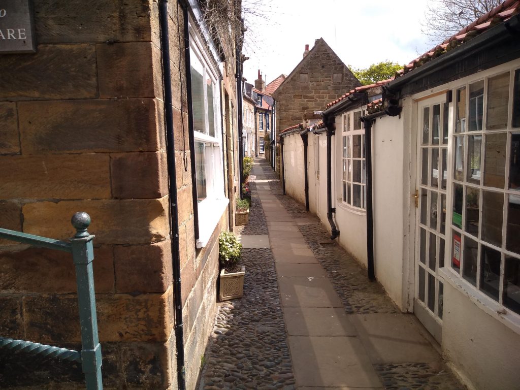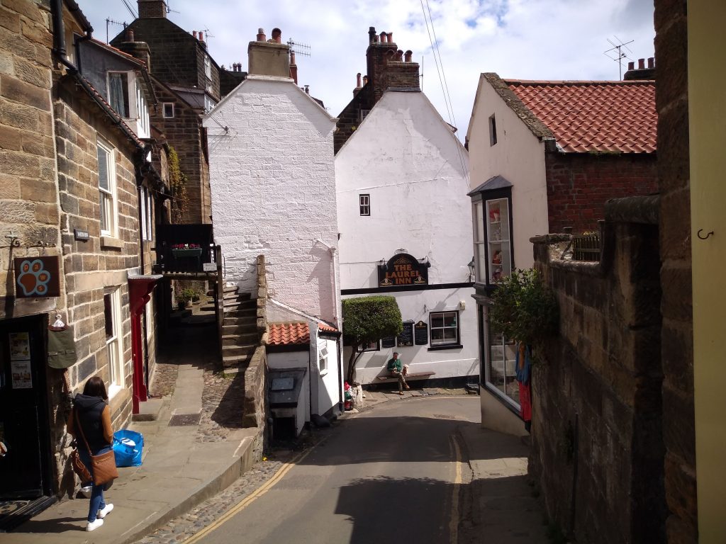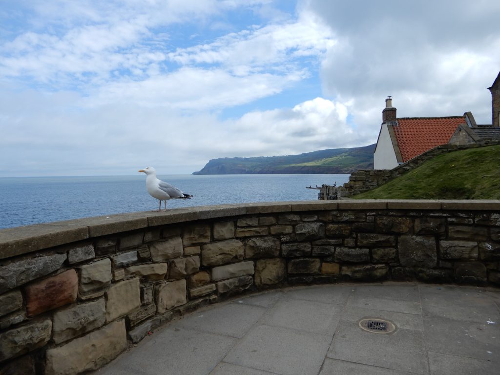 We stop here in Robin Hood’s Bay and eat fish and chips on the sea wall